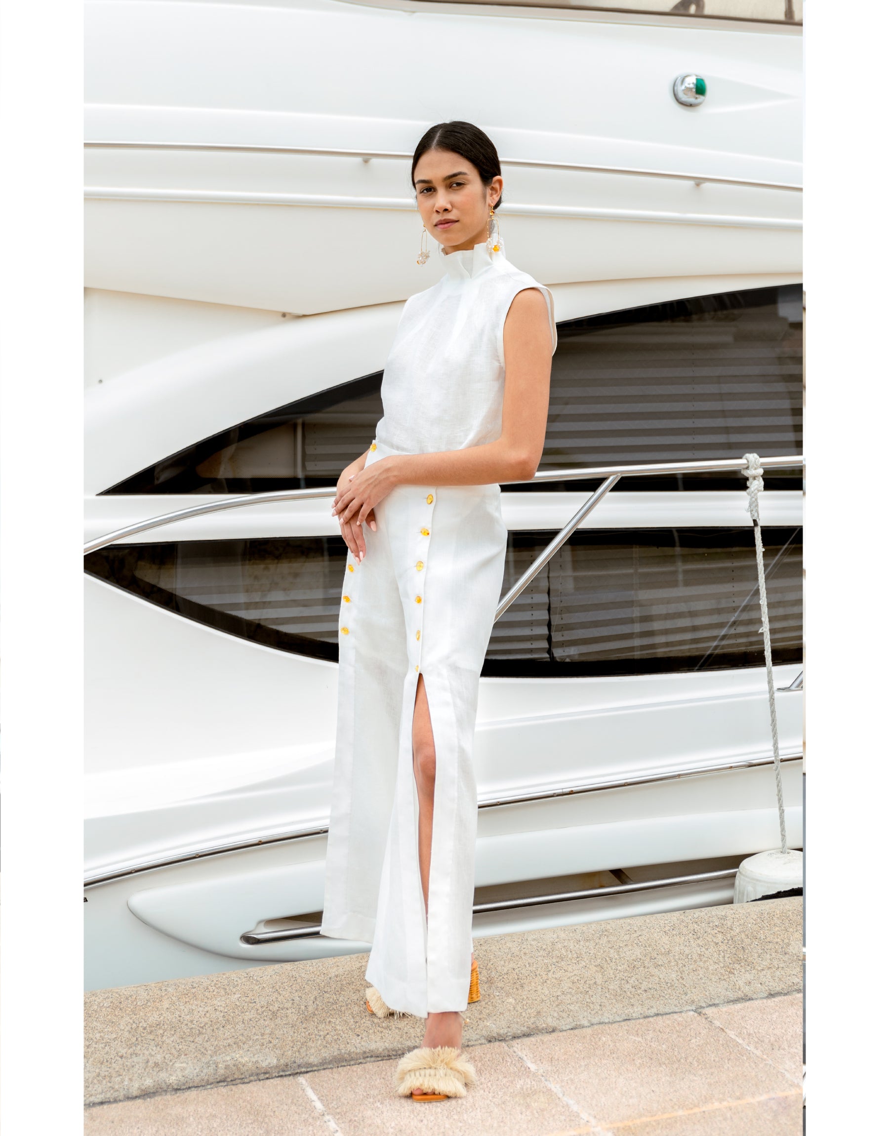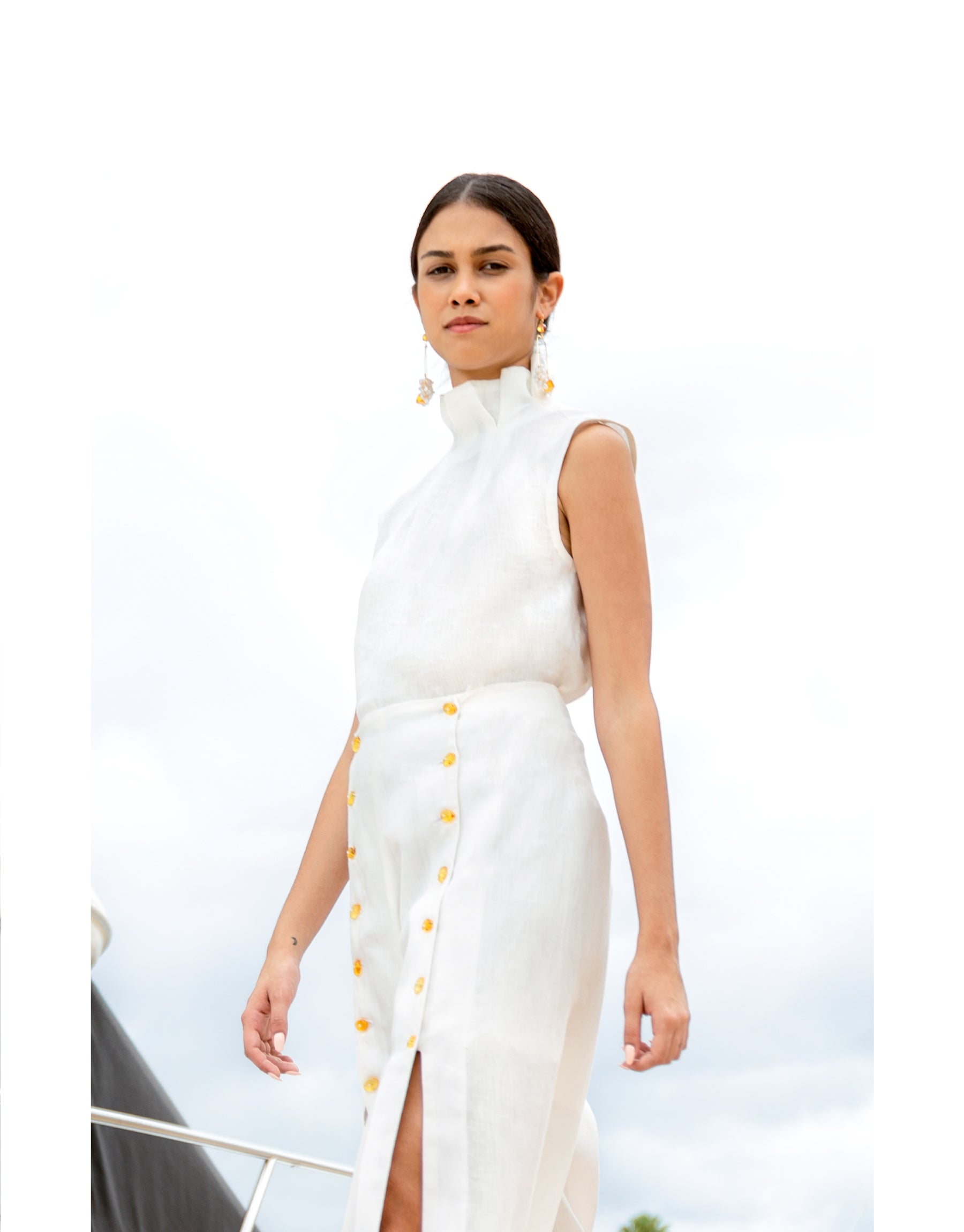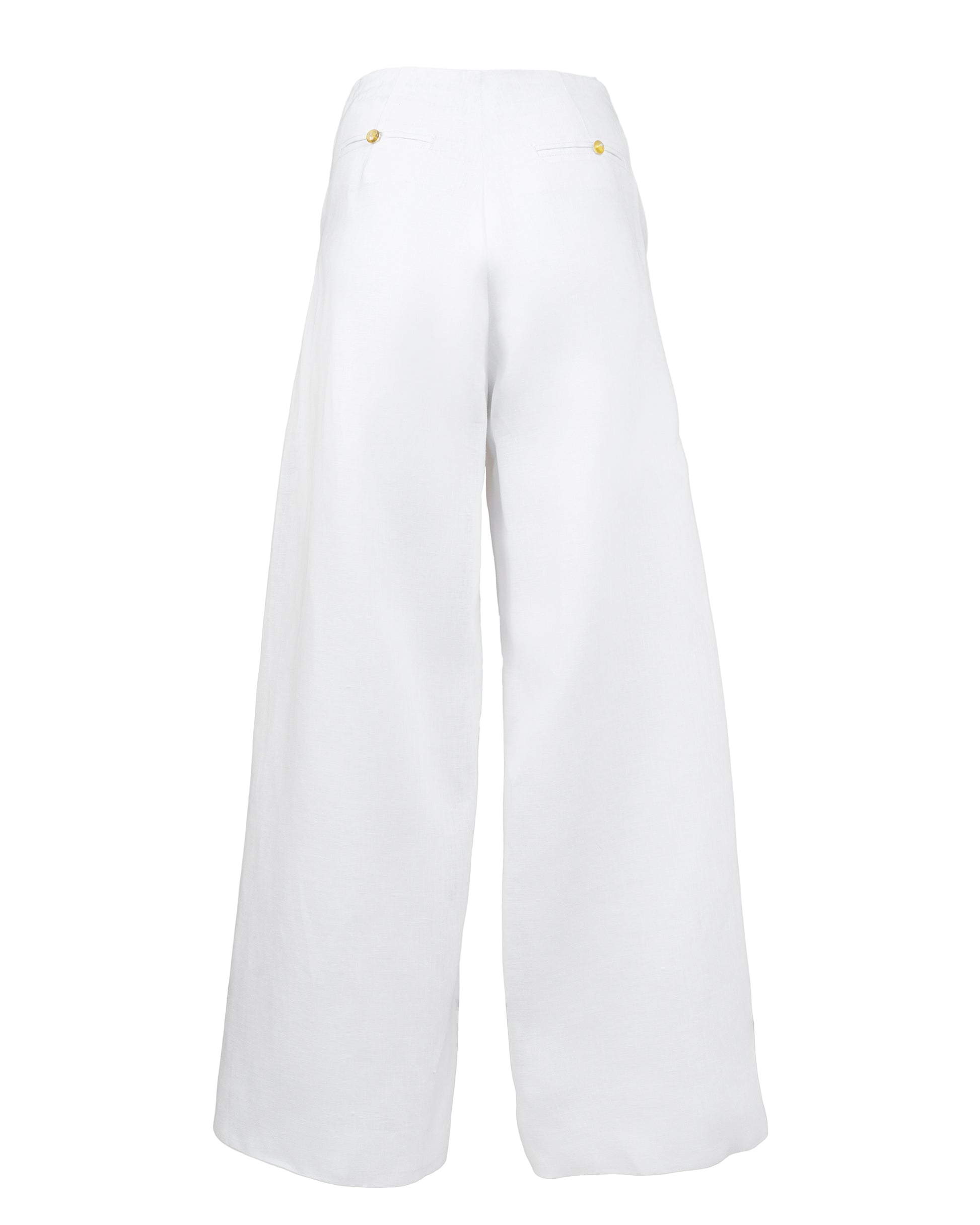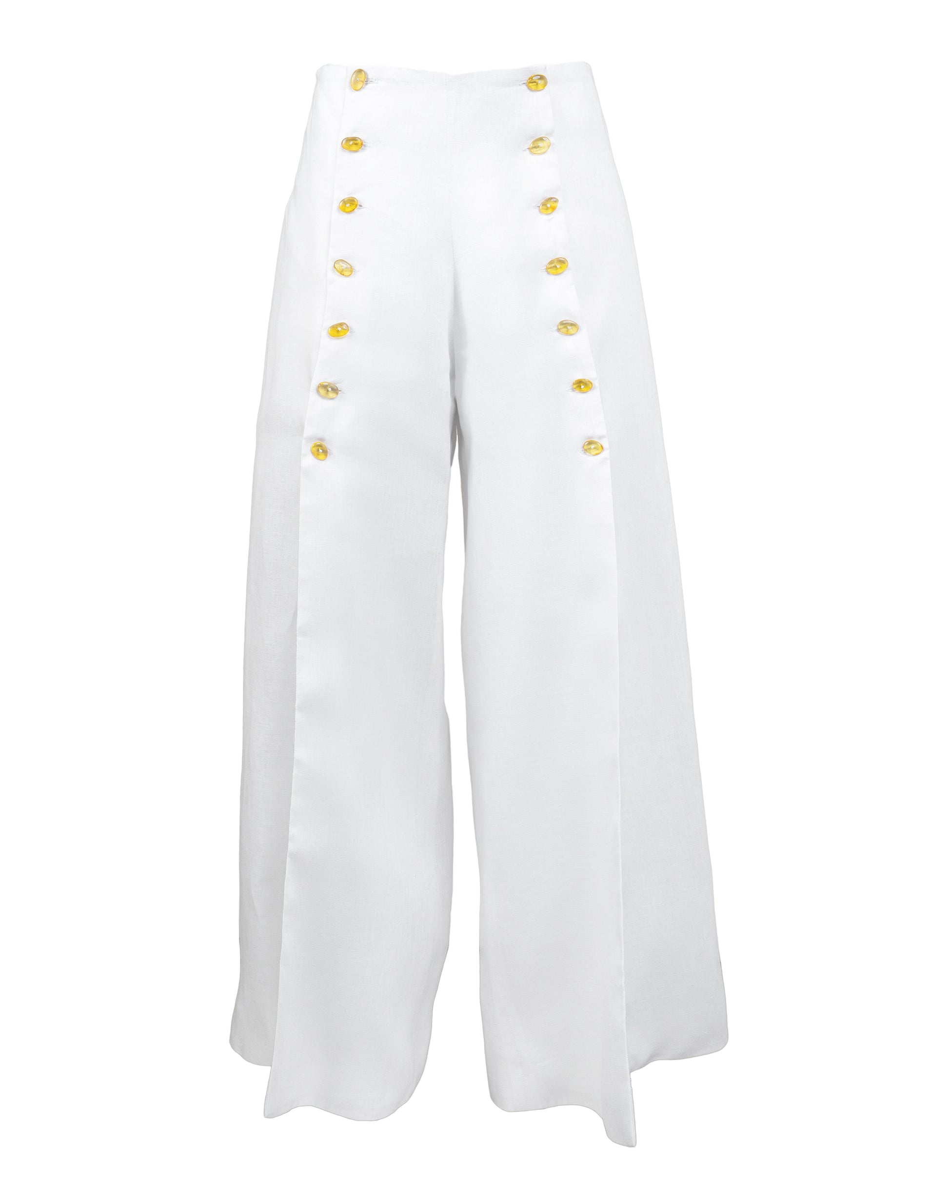 These pants belong to the Resort 2022 Collection. Made with 100% white linen and opening in the legs. It has details of 16 round amber buttons.