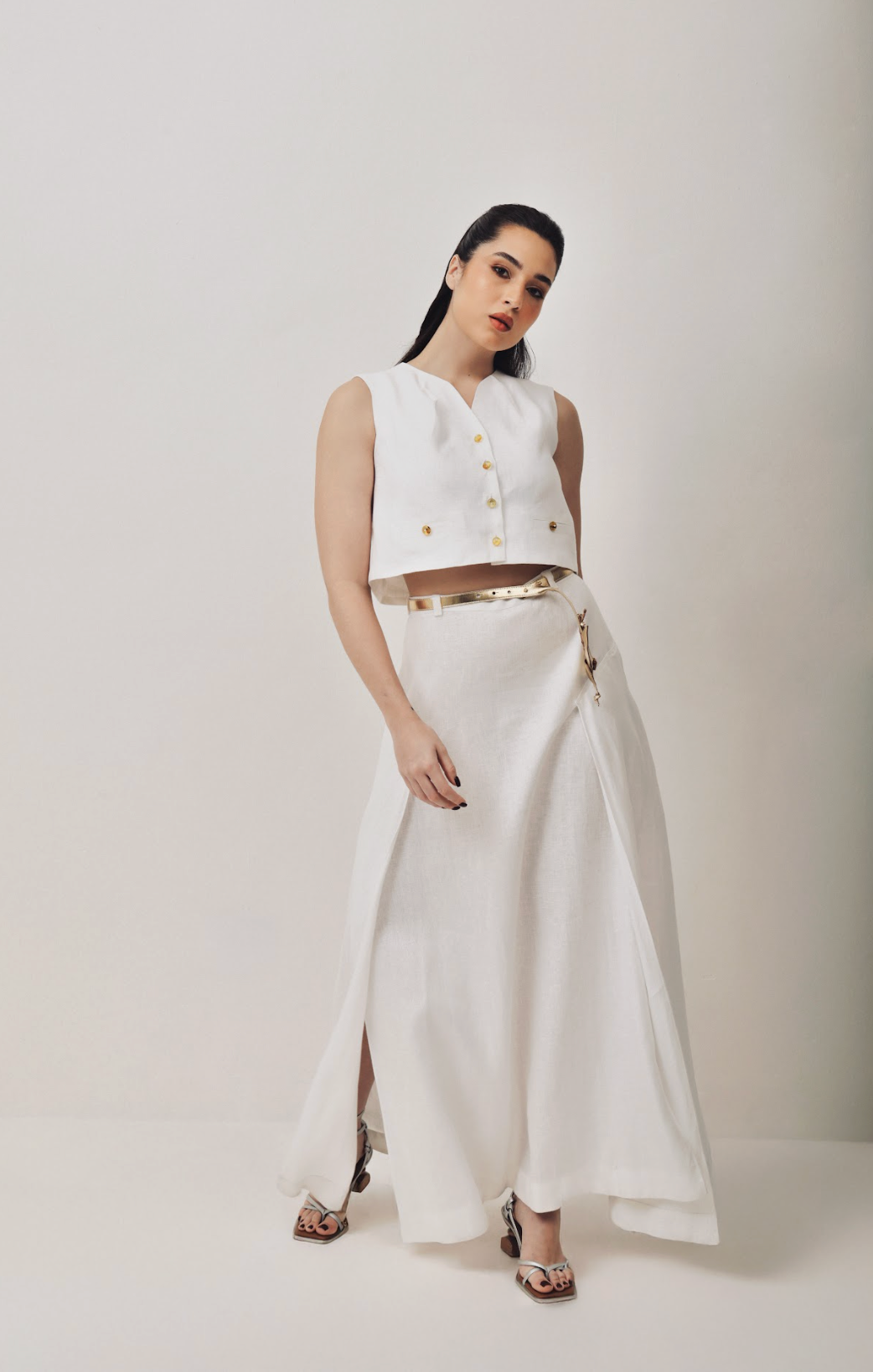 This blouse is a celebration of Caribbean refinement and feminine strength expressed through the purest simplicity. Made from natural white linen, its clean and contemporary structure enhances the freshness of the material, while the cropped silhouette adds a modern and versatile touch.
