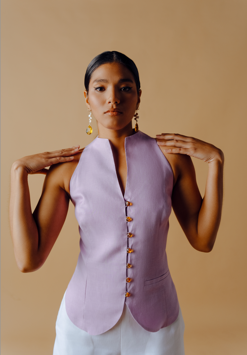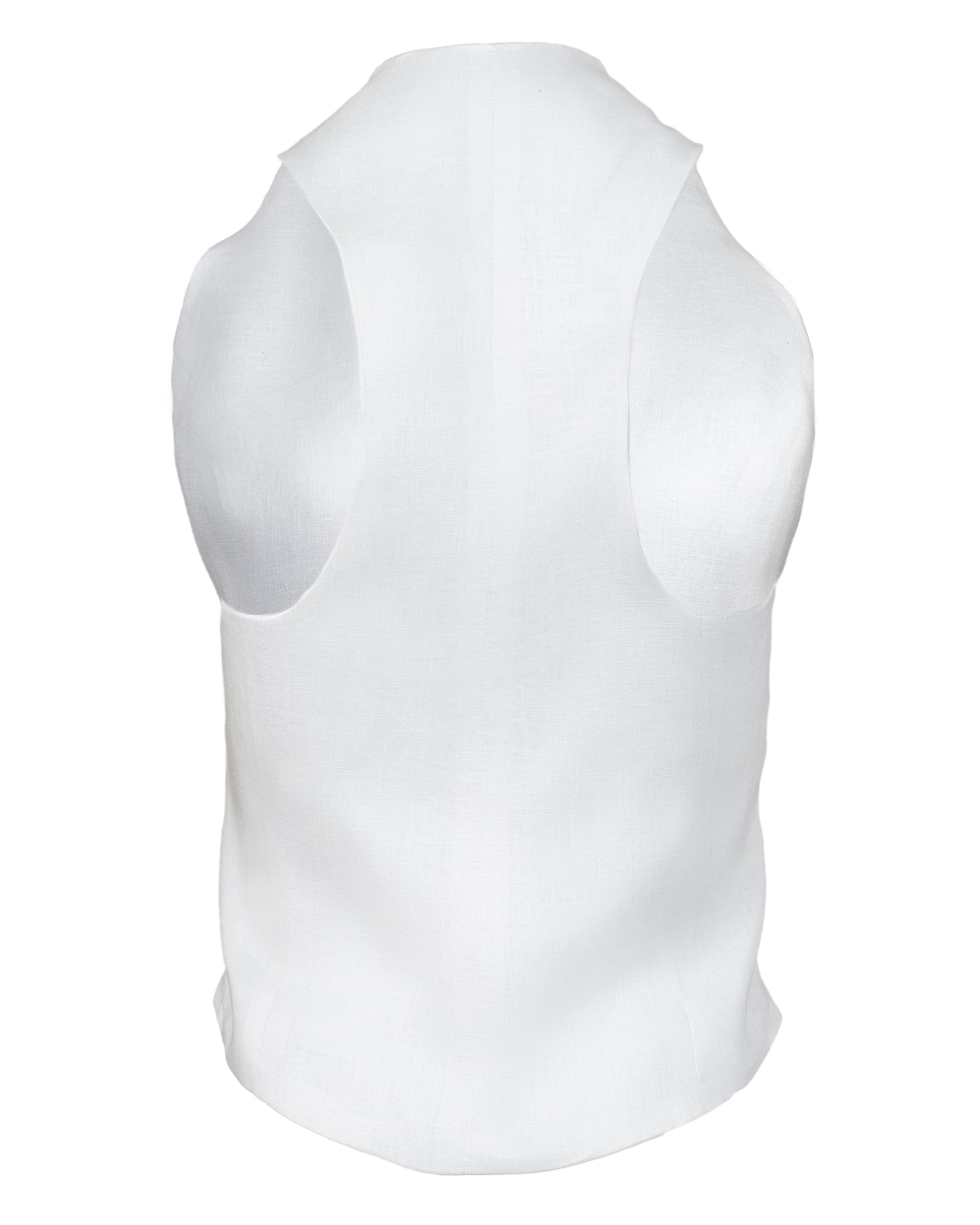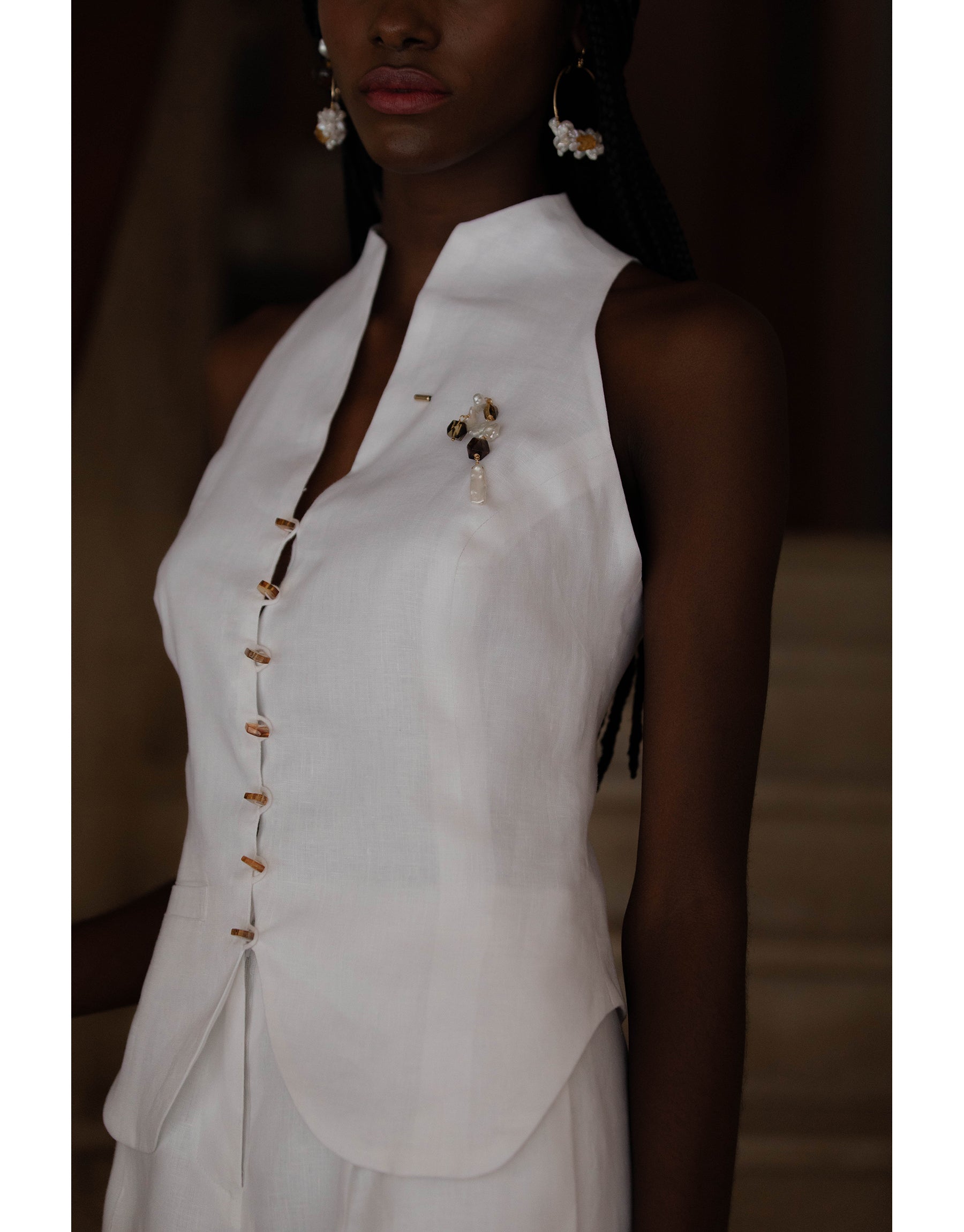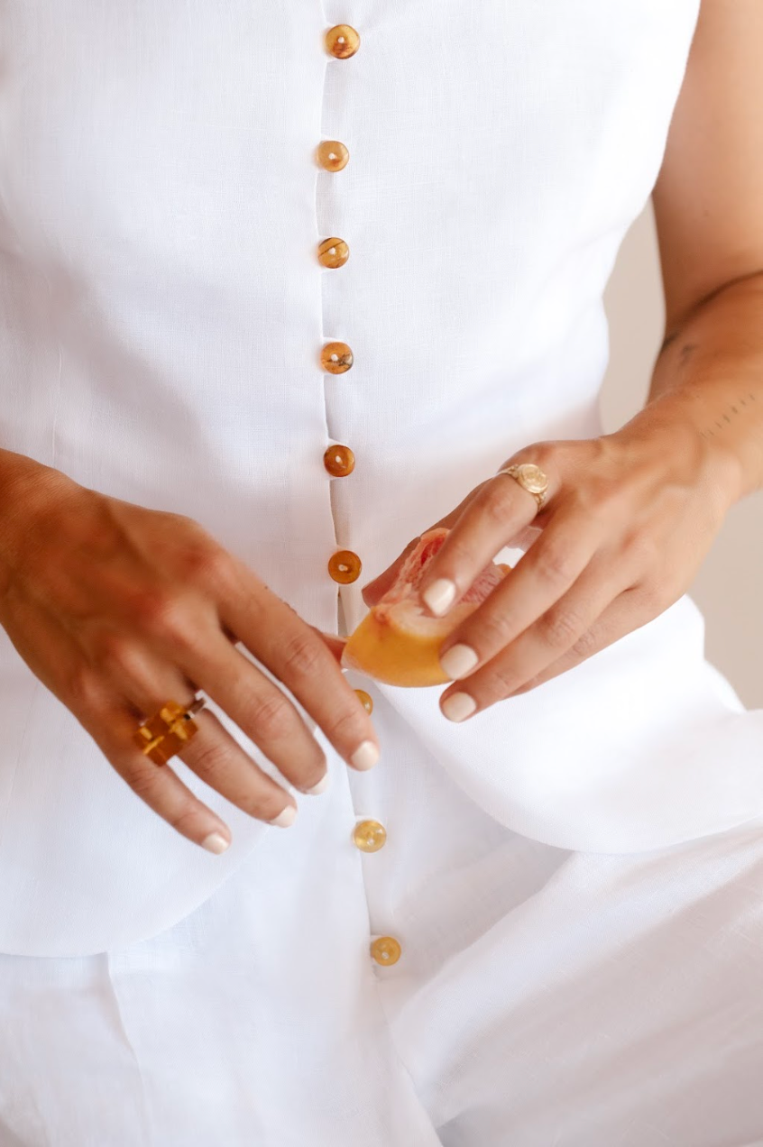Blusa chaleco en Lino blanco con botones de ámbar hexagonales.