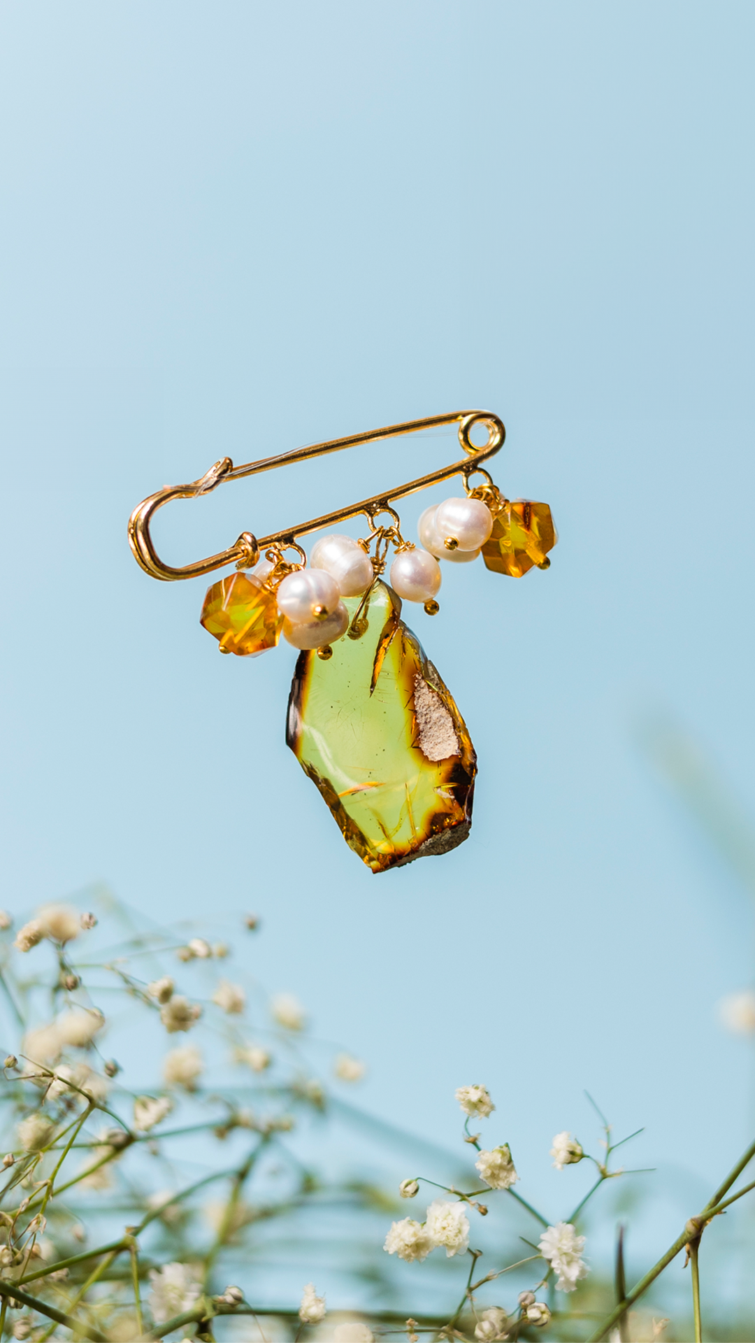 Chambra de Ámbar hexagonal, coin y perlas de agua dulce montado en plata 925.