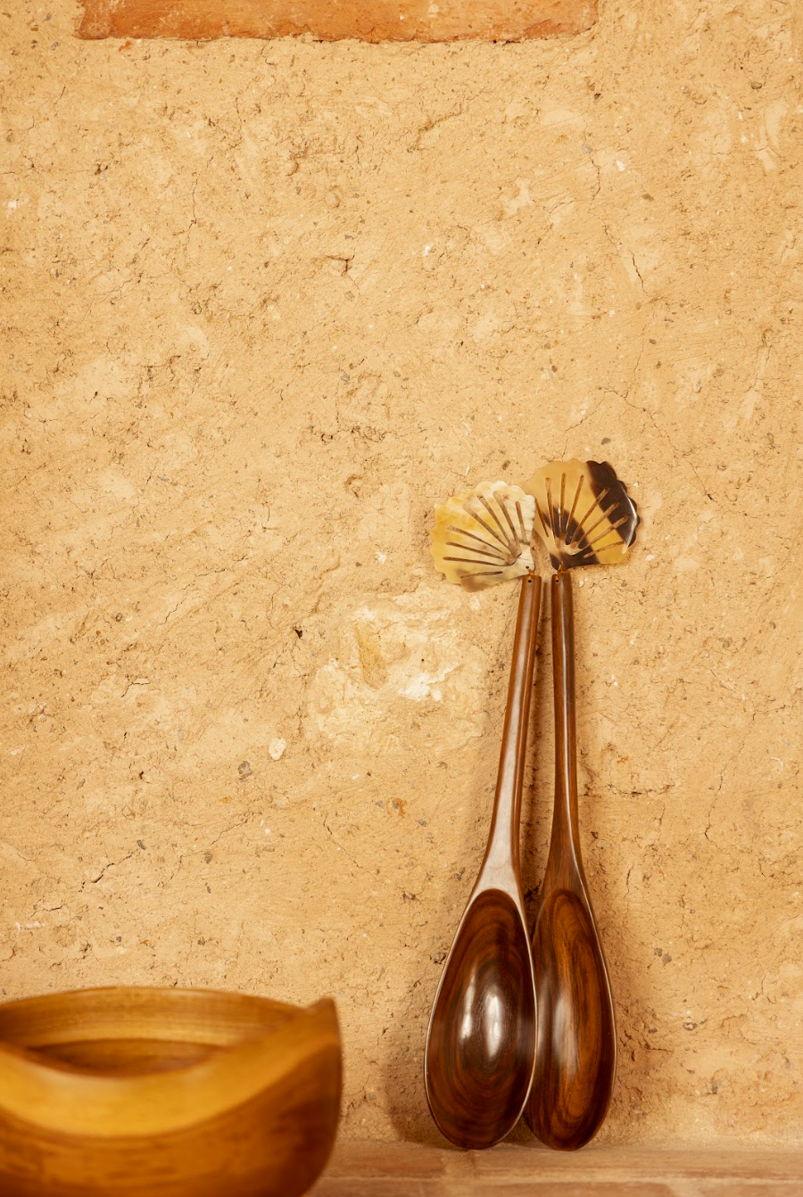 Recibe a tus seres queridos con nuestro juego de cucharas artesanales en cuerno y detalles en madera de guayacán.