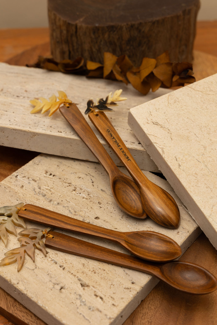 Juego de 4 cucharas de café artesanales en madera de guayacán y cuerno en forma de concha.