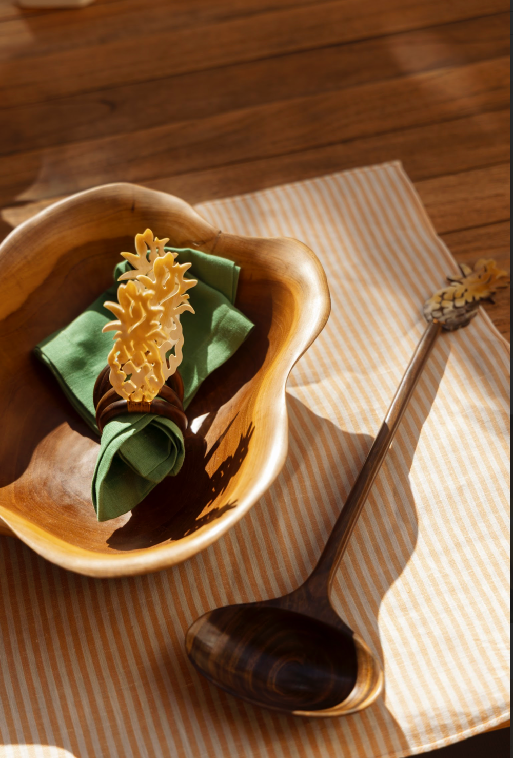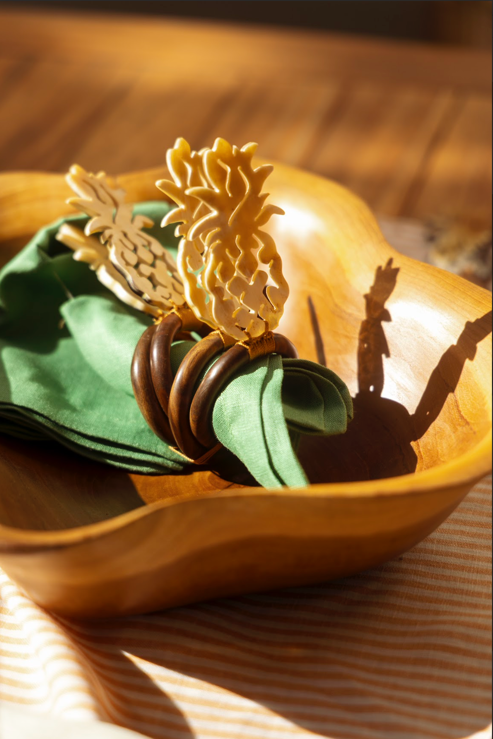 Juego de 4 servilleteros artesanales en madera de guayacán y cuerno en forma de piña.