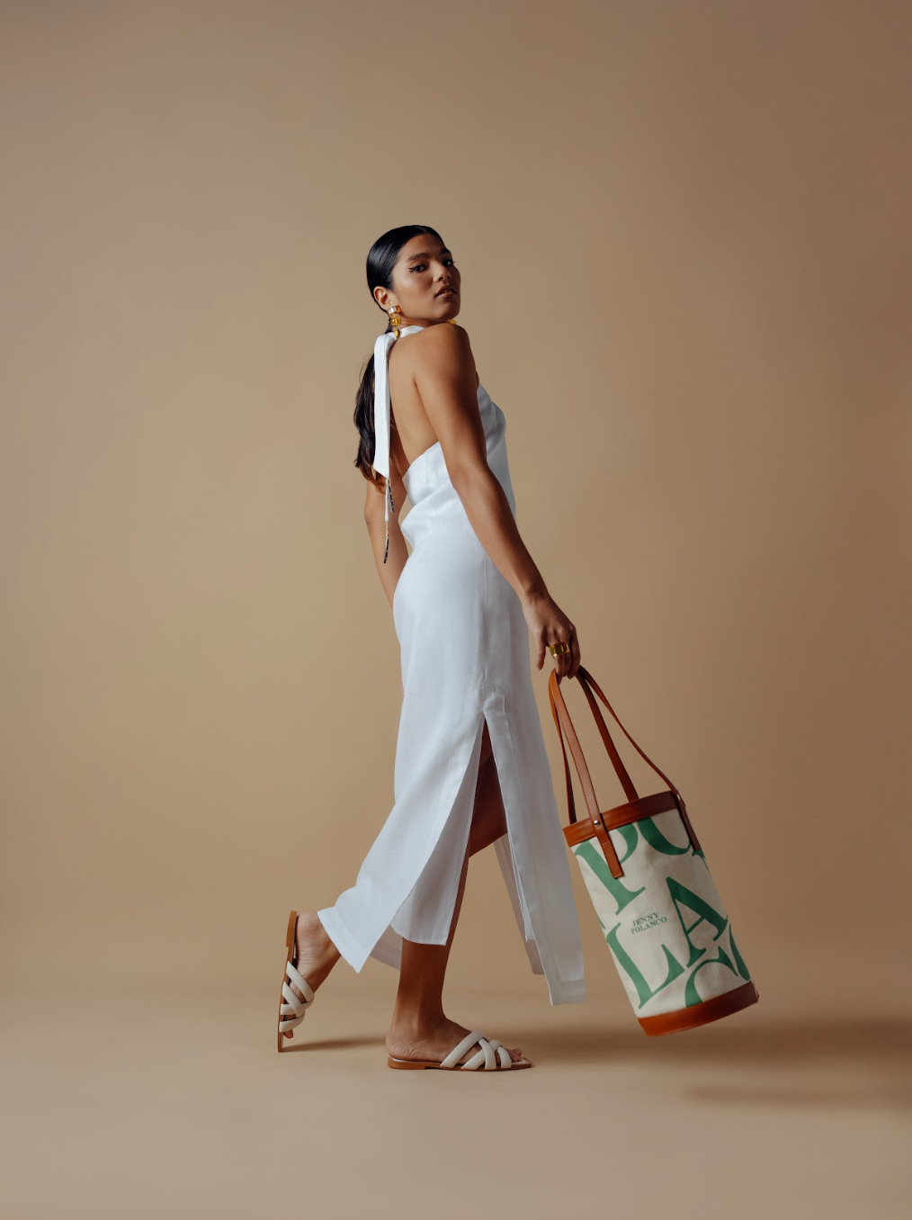 Elaborada con 100% lino, forrado en rayón suave para facilitar su uso. Tiene detalles de cuerno de vaca.